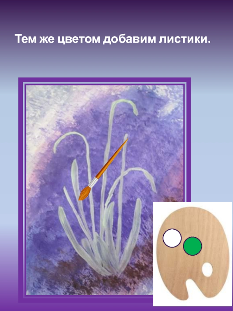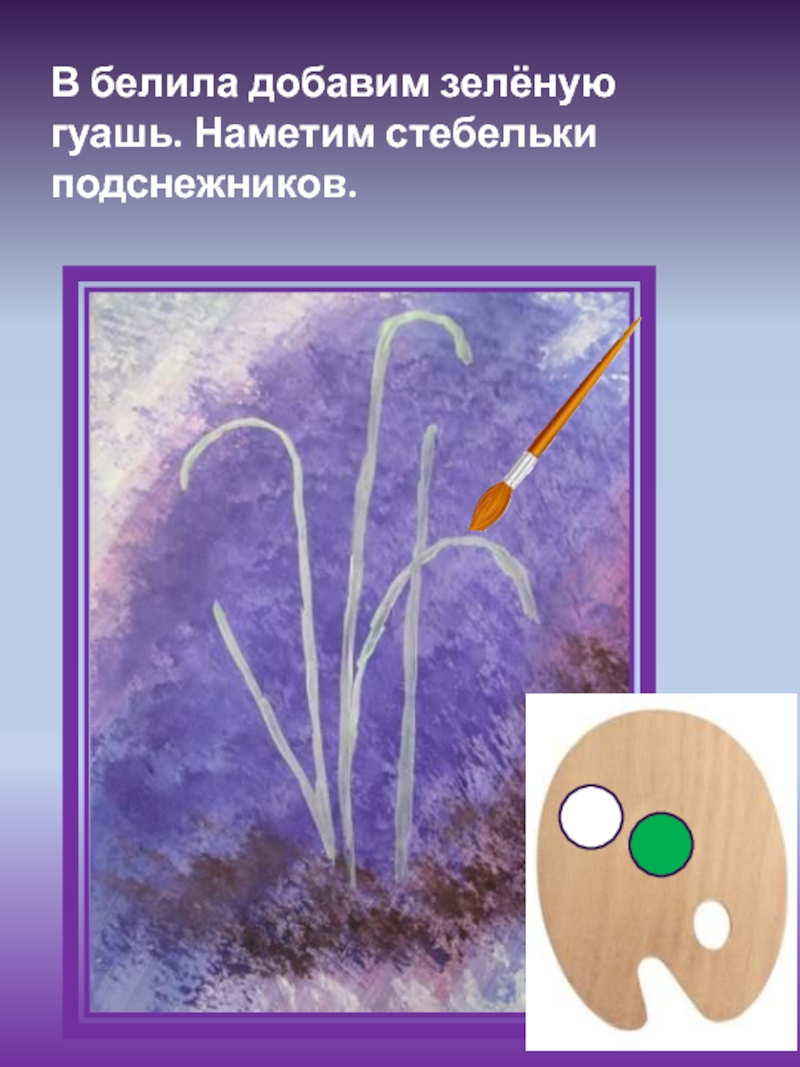Слайд 6В белила добавим зелёную гуашь. Наметим стебельки подснежников.
