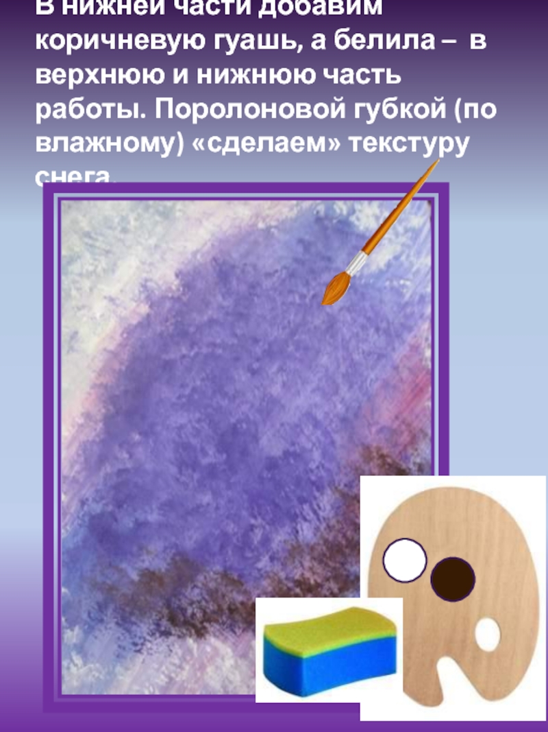 В нижней части добавим коричневую гуашь, а белила – в верхнюю и нижнюю часть работы. Поролоновой губкой