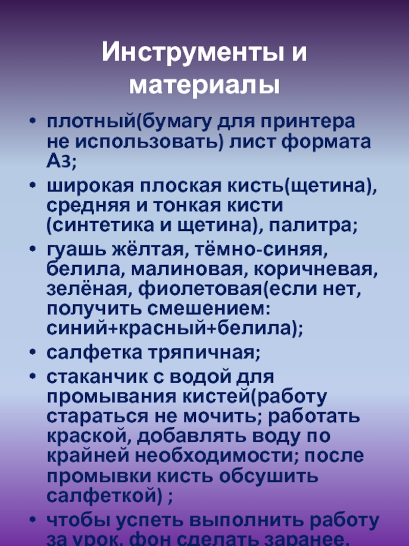 Инструменты и материалыплотный(бумагу для принтера не использовать) лист формата А3;широкая плоская кисть(щетина), средняя и тонкая кисти (синтетика и щетина), палитра;гуашь жёлтая, тёмно-синяя, белила, малиновая, коричневая, зелёная, фиолетовая(если нет, получить смешением: синий+красный+белила);салфетка