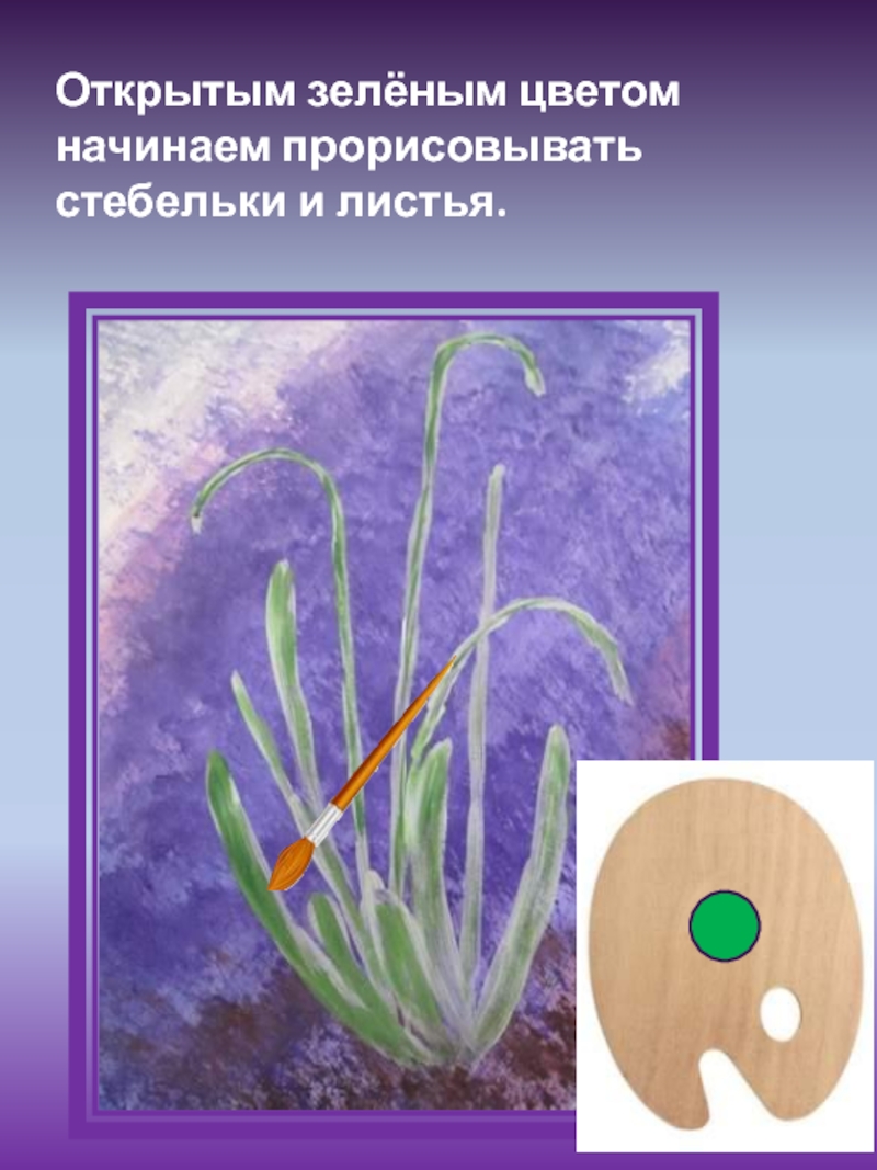 Слайд 8Открытым зелёным цветом начинаем прорисовывать стебельки и листья.