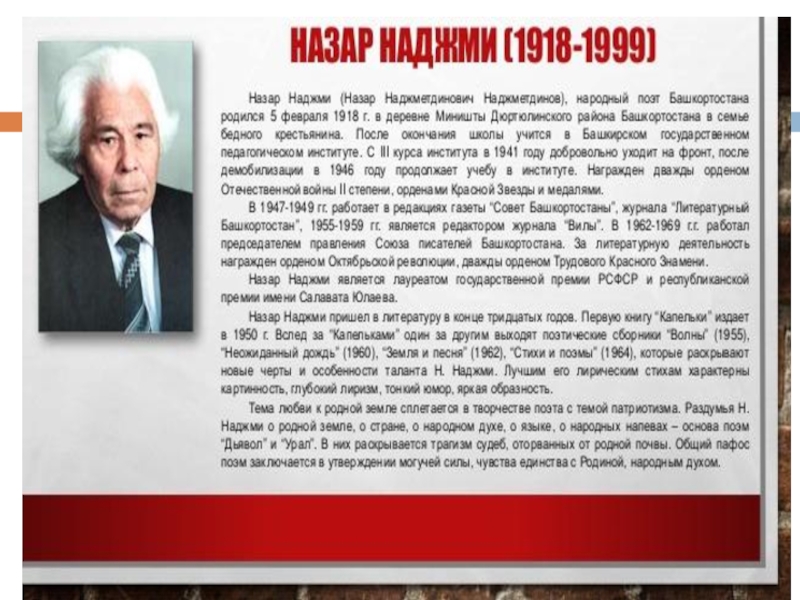 новый уровень традиции классической башкирской литературы. Его творчество стало олицетворением башкирской литературы и всей нашей республики, а книги переведены на десятки языков. Из-под пера Мустая Карима вышли выдающиеся произведения, вошедшие в золотой фонд башкирской литературы и театра.Мустай Карим не только великий башкирский поэт, писатель, драматург, публицист, но и воин, участник Великой Отечественной войны, кавалер многих боевых и трудовых орденов и медалей, выдающийся общественный деятель. Умер Мустай Карим на 86-ом году жизни 21 сентября 2005 года.