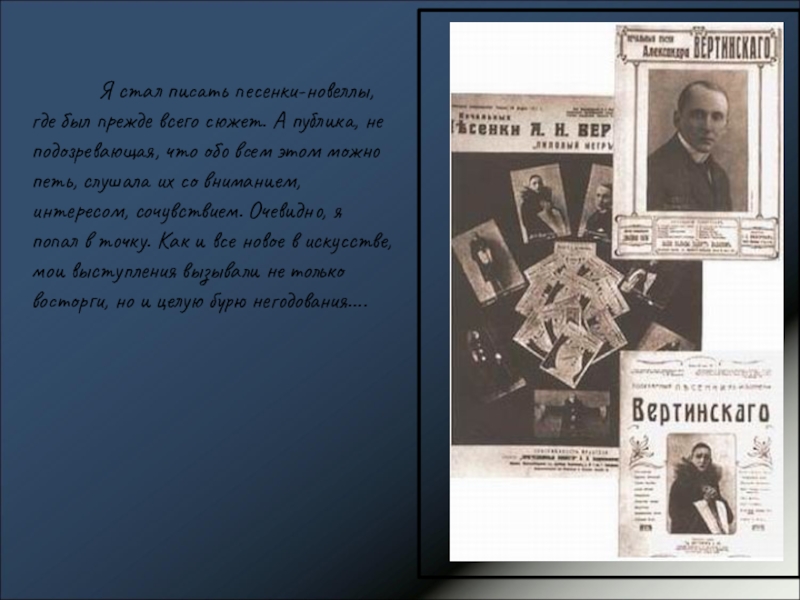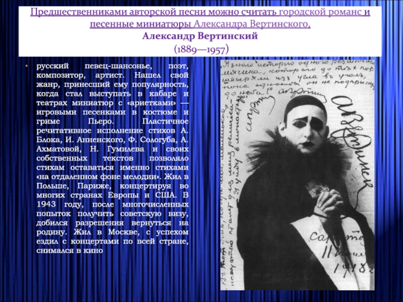 Предшественниками авторской песни можно считать городской романс и песенные миниатюры Александра Вертинского.