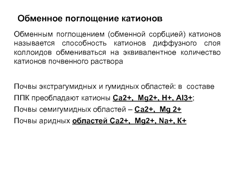 Почвы экстрагумидных и rумидных областей: в составе ППК преобладают катионы Са2+, Мg2+, Н+, Аl3+;