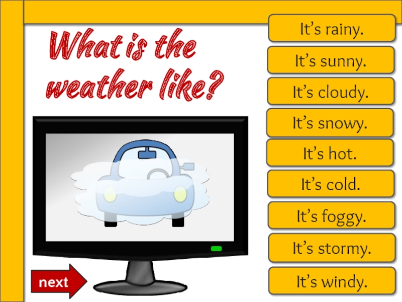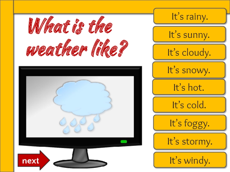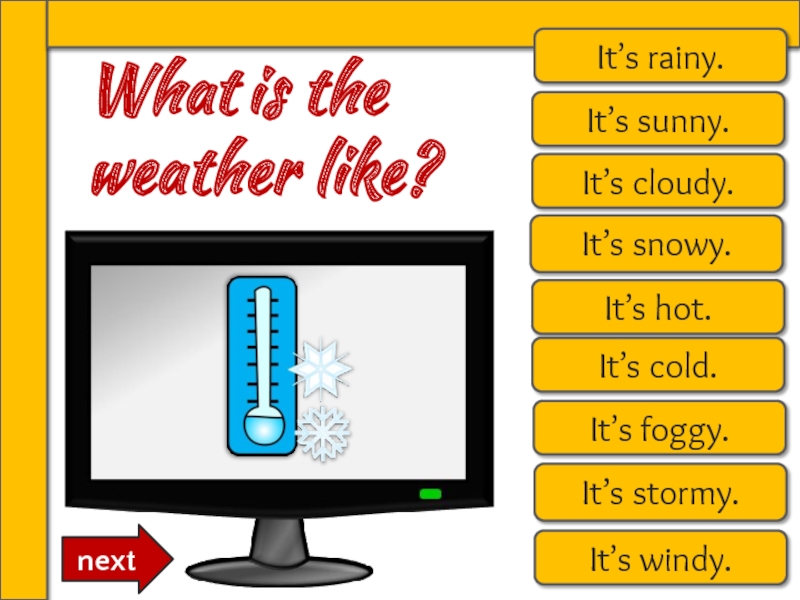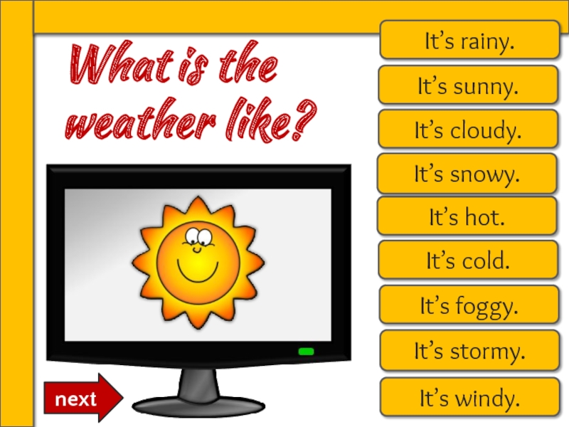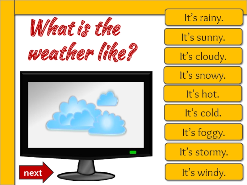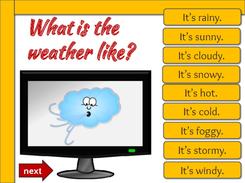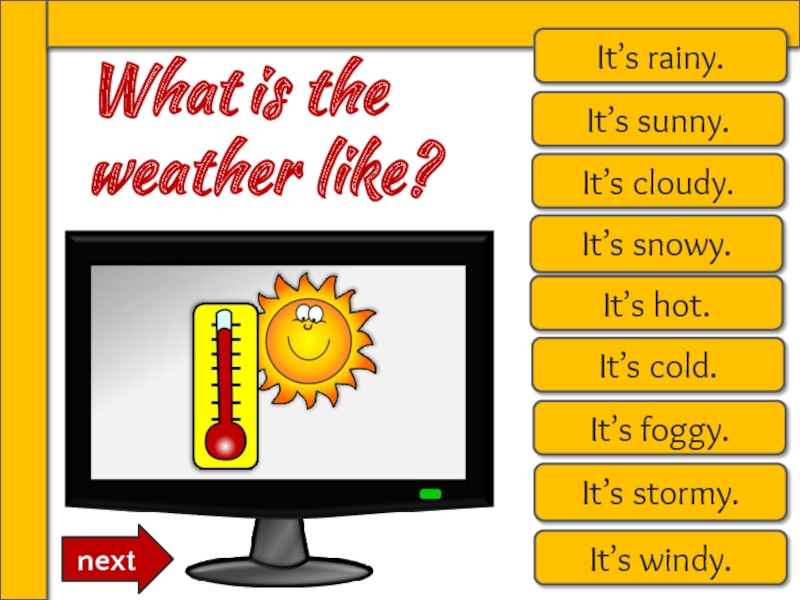What is the weather like?It’s rainy.It’s sunny.It’s cloudy.It’s windy.It’s hot.It’s cold.It’s foggy.It’s stormy.It’s snowy.next