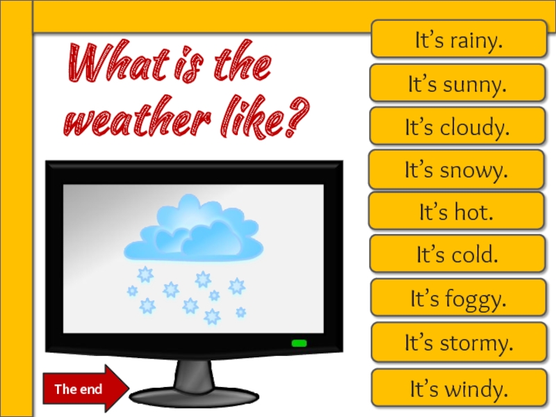 It’s rainy.It’s sunny.It’s cloudy.It’s windy.It’s hot.It’s cold.It’s foggy.It’s stormy.It’s snowy.What is the weather like?The end