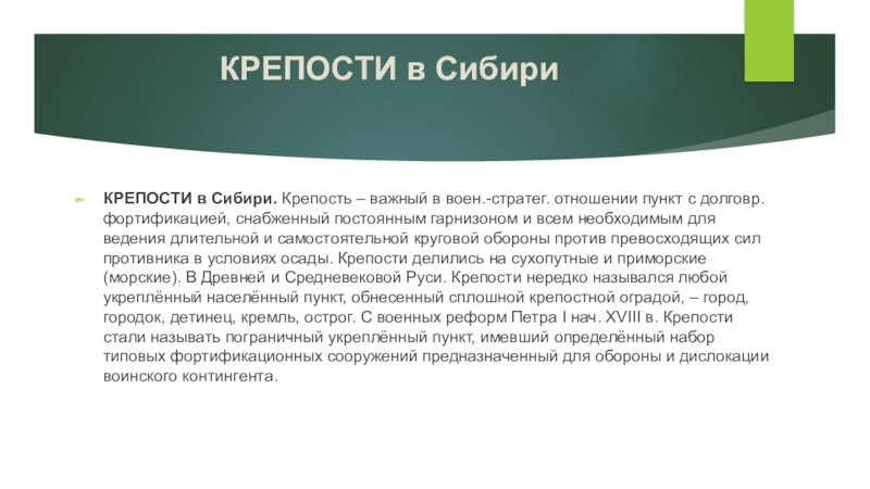 КРЕПОСТИ в Сибири. Крепость – важный в воен.-стратег. отношении