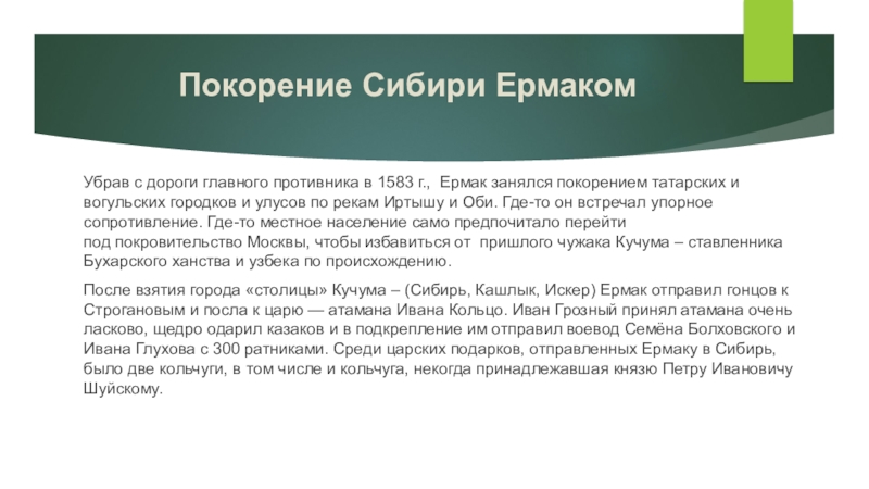 бывает в истории, поплатились своими жизнями. Но притязания русских на Сибирь впервые было обозначено именно воинами атамана Ермака. За ними пришли другие покорители. Достаточно скоро вся Западная Сибирь «почти добровольно» пошла в вассальную, а потом и в административную зависимость от Москвы.