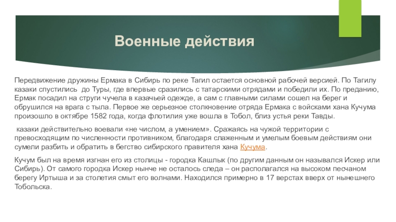 казаки действительно воевали «не числом, а умением». Сражаясь на чужой территории с превосходящим по численности противником, благодаря слаженным и умелым боевым действиям они сумели разбить и обратить в бегство сибирского правителя хана Кучума.