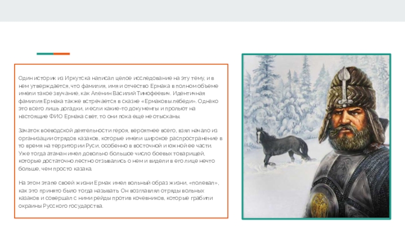 в полном объеме имели такое звучание, как Аленин Василий Тимофеевич. Идентичная фамилия Ермака также встречается в сказке «Ермаковы лебеди». Однако это всего лишь догадки, и если какие-то документы и прольют на настоящие ФИО Ермака свет, то они пока еще не отысканы.