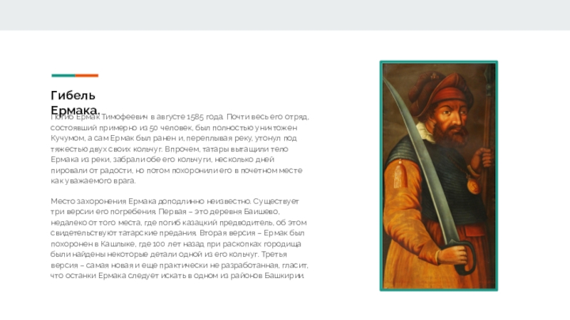 Кучумом, а сам Ермак был ранен и, переплывая реку, утонул под тяжестью двух своих кольчуг. Впрочем, татары вытащили тело Ермака из реки, забрали обе его кольчуги, несколько дней пировали от радости, но потом похоронили его в почетном месте как уважаемого врага.