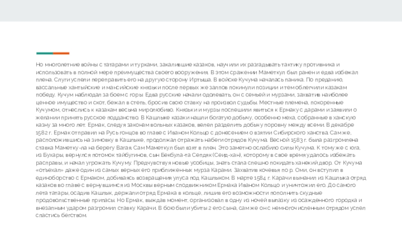 дружина не знала поражений; ни голод, ни суровые морозы не сломили волю казаков. Именно поход Ермака подготовил присоединение Сибири к России.