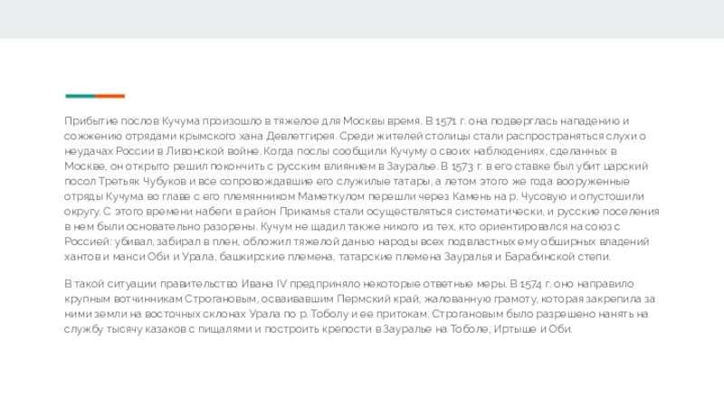 В такой ситуации правительство Ивана IV предприняло некоторые ответные меры. В 1574 г. оно направило крупным вотчинникам Строгановым, осваивавшим Пермский край, жалованную грамоту, которая закрепила за ними земли на восточных склонах Урала по р. Тоболу и ее притокам. Строгановым было разрешено нанять на службу тысячу казаков с пищалями и построить крепости в Зауралье на Тоболе, Иртыше и Оби.