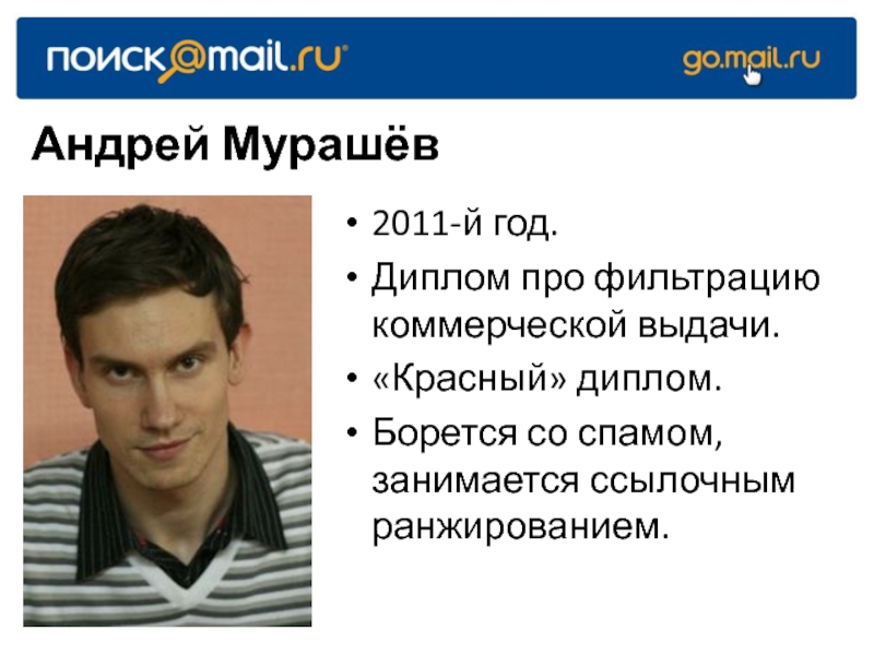 Андрей Мурашёв2011-й год.Диплом про фильтрацию коммерческой выдачи. «Красный» диплом.Борется со спамом, занимается ссылочным ранжированием.