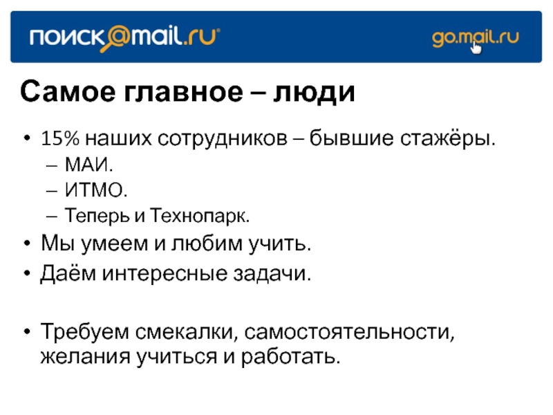 Самое главное – люди15% наших сотрудников – бывшие стажёры.МАИ.ИТМО.Теперь и Технопарк. Мы умеем и любим учить.Даём интересные