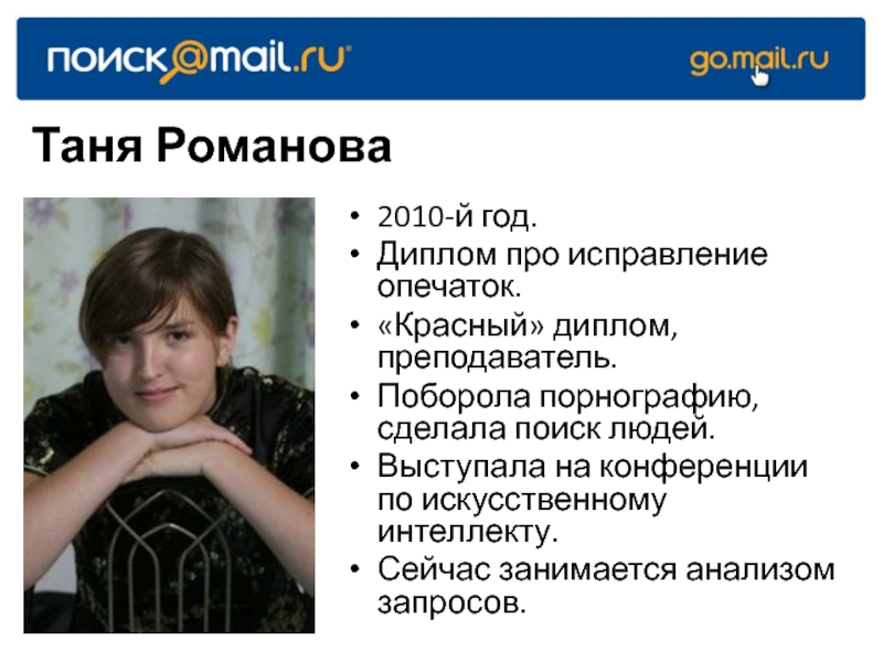 Таня Романова2010-й год.Диплом про исправление опечаток. «Красный» диплом, преподаватель.Поборола порнографию, сделала поиск людей.Выступала на конференции по искусственному
