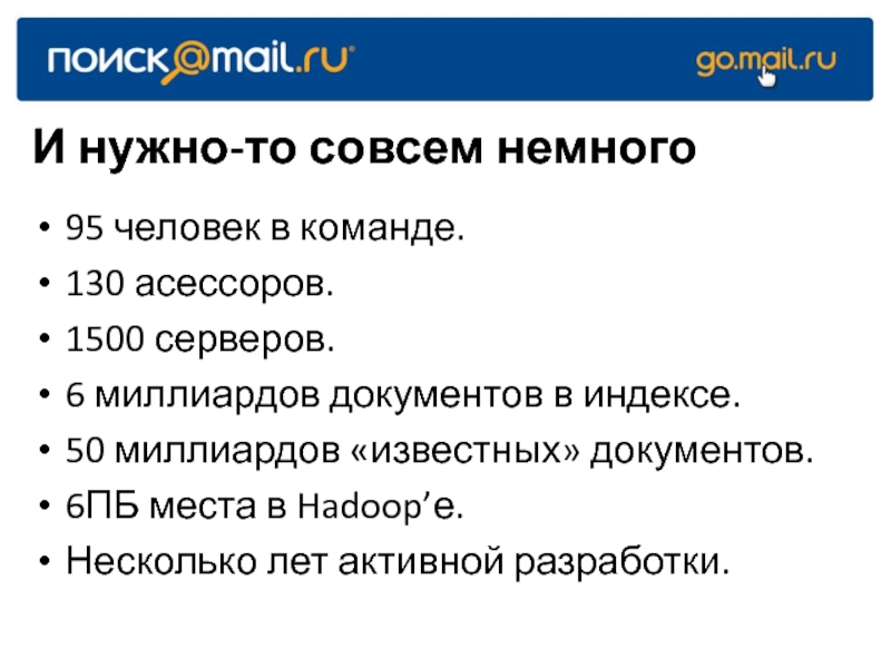 И нужно-то совсем немного95 человек в команде. 130 асессоров.1500 серверов.6 миллиардов документов в индексе.50 миллиардов «известных» документов.6ПБ