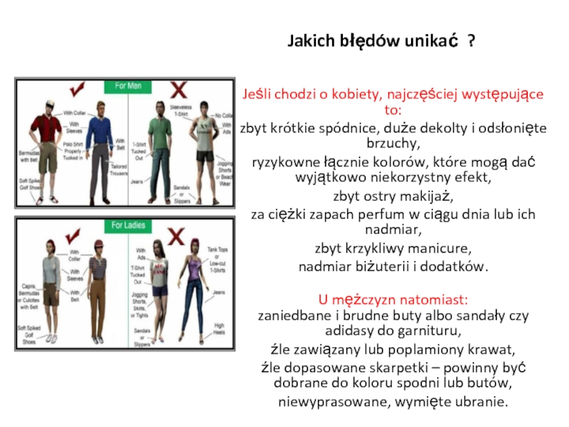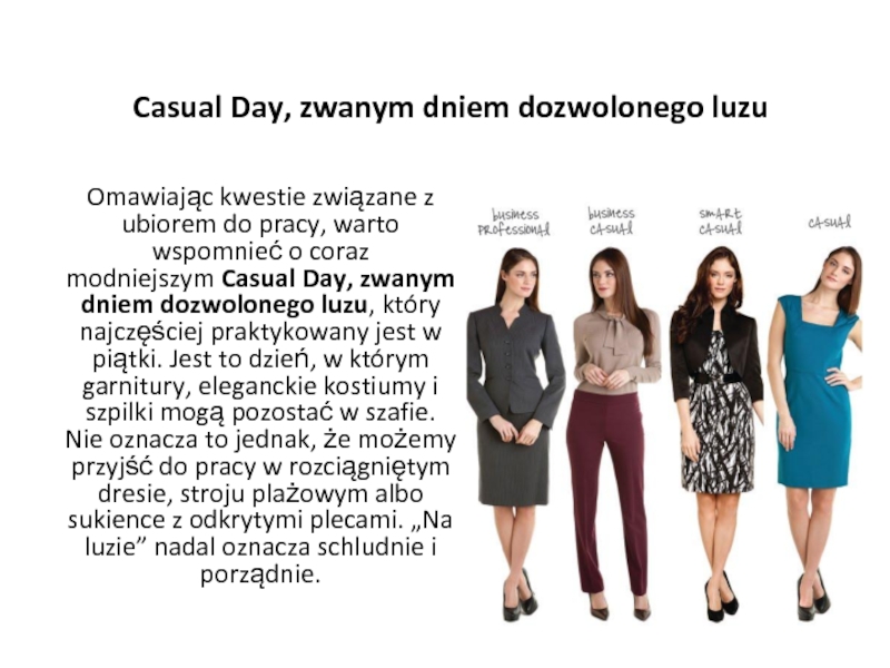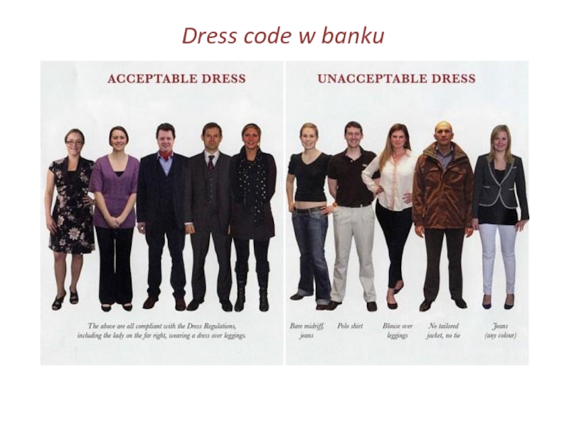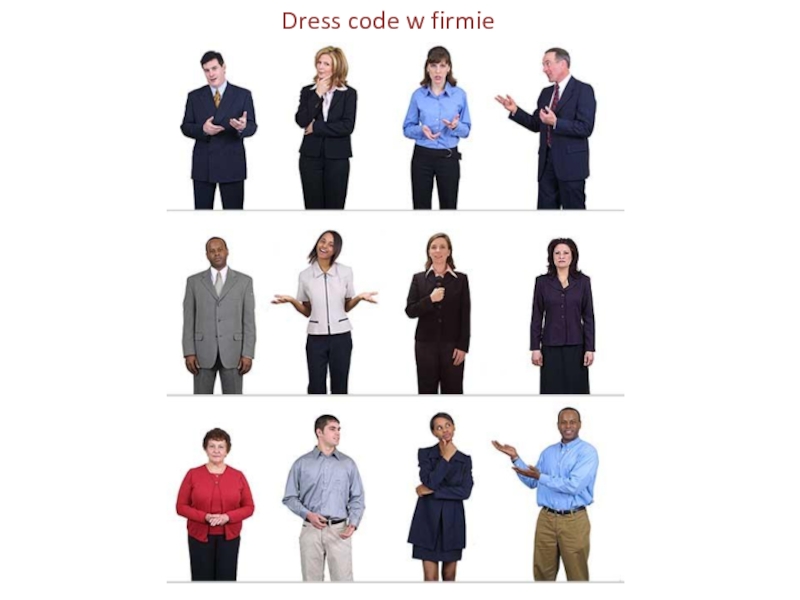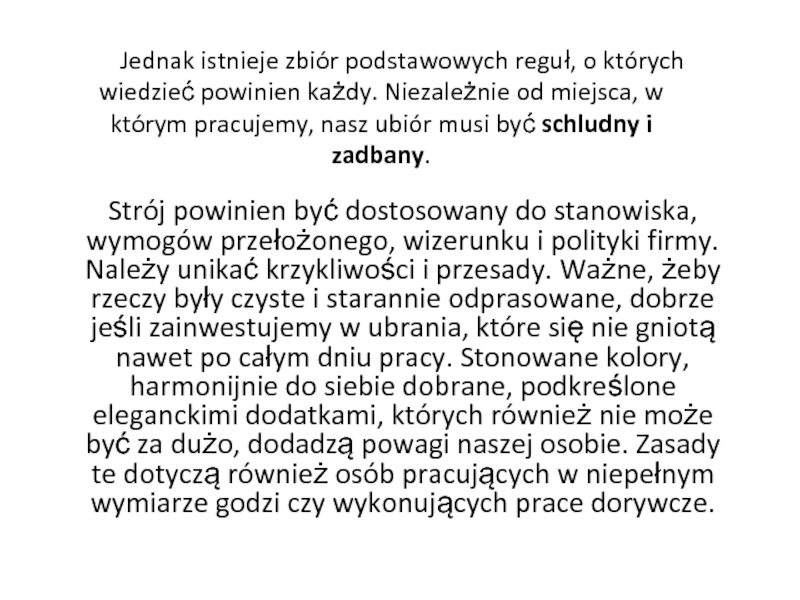 Strój powinien być dostosowany do stanowiska, wymogów przełożonego, wizerunku i polityki firmy. Należy unikać krzykliwości i przesady. Ważne, żeby rzeczy były czyste i starannie odprasowane, dobrze jeśli zainwestujemy w ubrania, które się nie gniotą nawet po całym dniu pracy. Stonowane kolory, harmonijnie do siebie dobrane, podkreślone eleganckimi dodatkami, których również nie może być za dużo, dodadzą powagi naszej osobie. Zasady te dotyczą również osób pracujących w niepełnym wymiarze godzi czy wykonujących prace dorywcze.