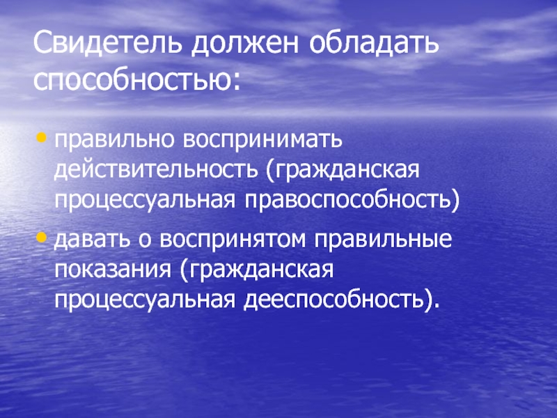 Свидетель должен обладать способностью: правильно воспринимать действительность (гражданская процессуальная правоспособность) давать о воспринятом правильные показания (гражданская процессуальная