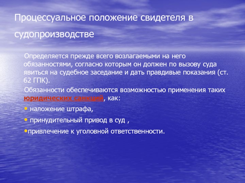 Слайд 6Процессуальное положение свидетеля в судопроизводстве