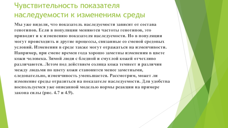 генотипов, это приводит и к изменению показателя наследуемости. Но в популяции могут происходить и другие процессы, связанные со сменой средовых условий. Изменения в среде также могут отражаться на изменчивости. Например, при смене времен года хорошо заметны изменения в цвете кожи человека. Зимой люди с бледной и смуглой кожей отчетливо различаются. Летом под действием солнца кожа темнеет и различия между людьми по цвету кожи становятся менее заметными, следовательно, изменчивость уменьшается. Рассмотрим, может ли изменение среды отразиться на показателе наследуемости. Для удобства воспользуемся уже описанной моделью нормы реакции на примере закона силы (рис. 4.7 и 4.9).