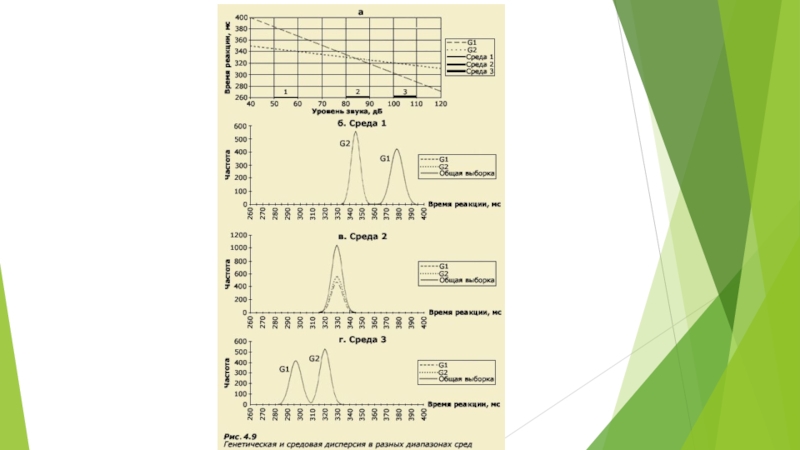 изменение окружающих условий. В нашем случае это время сенсомоторной реакции (ВСМР) на звуки разной интенсивности. На рисунке 4.9а изображены графики нормы реакции каждого генотипа. На оси ординат отложены значения фенотипа - в нашем примере это величины ВСМР, а в принципе это может быть любая количественная величина, поддающаяся измерению. На оси абсцисс отложены количественные значения параметров среды. В качестве средового параметра у нас выступает интенсивность звука, но теоретически это может быть любая характеристика среды (температура, концентрация какого-либо вещества в субстрате и иные поддающиеся контролю величины). Мы видим, что генотип G1 более чувствителен к среде, чем генотип G2. Графики норм реакции обоих генотипов пересекаются. Теперь рассмотрим, какие фенотипы будут представлены в популяции в различных диапазонах сред. На графике эти диапазоны обозначены тремя отрезками (среда 1, среда 2 и среда 3). Спроецируем эти отрезки на сами графики, и затем из точек пересечения проведем перпендикуляры на ось ординат, чтобы получить крайние значения фенотипов для генотипов G1 и G2 в каждом средовом диапазоне. На рисунке 4.9 б, в, г мы изобразили, какие фенотипы мы встретим в популяции в указанных диапазонах среды: на графиках представлены частотные распределения по каждому генотипу и по всей популяции в целом в средовых диапазонах 1, 2 и 3. Мы видим, что в диапазоне 2 (рис. 4.9 в) средние величины признака для обоих генотипов совпадают. Это означает, что здесь отсутствует дисперсия, возникающая за счет различий в средних значениях признака соответствующих генотипов, а мы знаем, что это и есть генетическая дисперсия. Значит, в нашем случае вся дисперсия представлена только средовой составляющей. Единственное отличие заключается в большей чувствительности генотипа G1 к среде. В результате распределение по популяции в целом будет выглядеть так, как показано на рисунке. Здесь одна мода, и практически нет генетической дисперсии (напомним, что генетическая дисперсия существует только тогда, когда имеются различия в средних значениях признака у особей с разными генотипами, а в нашем примере средние совпадают).