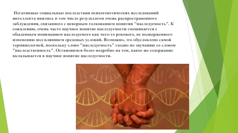 Слайд 4 Негативные социальные последствия психогенетических исследований интеллекта явились в том