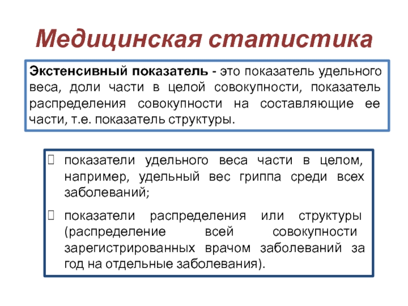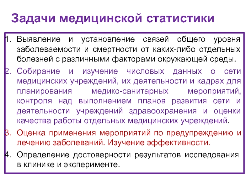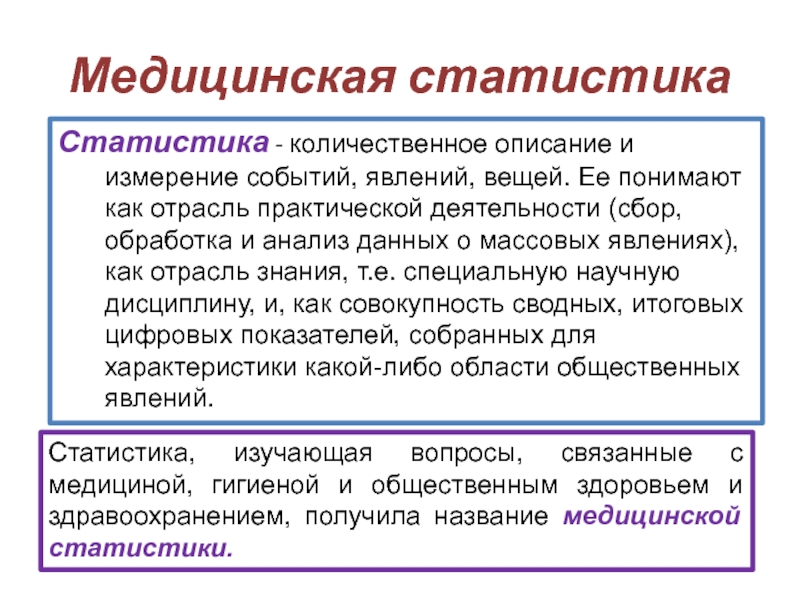 данных о массовых явлениях), как отрасль знания, т.е. специальную научную дисциплину, и, как совокупность сводных, итоговых цифровых показателей, собранных для характеристики какой-либо области общественных явлений.Статистика, изучающая вопросы, связанные с медициной, гигиеной и общественным здоровьем и здравоохранением, получила название медицинской статистики.