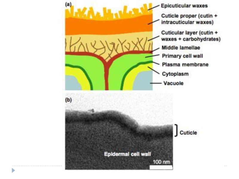 извилистые, наружные толстые и инкрустированы жироподобным веществом кутином, при застывания которого образуется пленка – кутикула. Поверх нее может откладываться эпикутикулярный воск, придающий сизый налет. Кутикула и воск создают дополнительную защиту. Кутикула во влажную погоду проницаема для газов и жидкостей, а в сухую – нет.