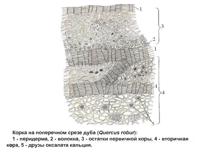 вторичная кора, 5 - друзы оксалата кальция.