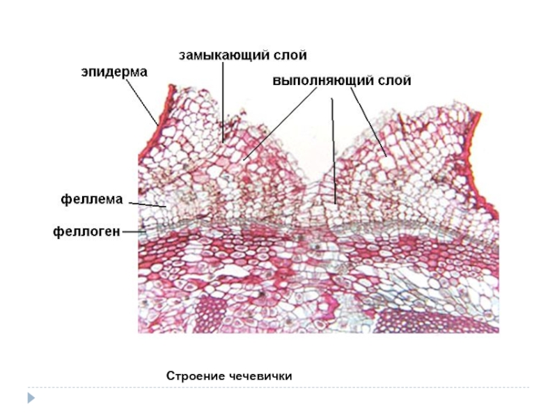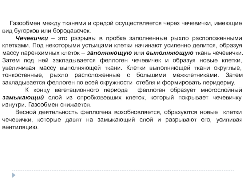 разрывы в пробке заполненные рыхло расположенными клетками. Под некоторыми устьицами клетки начинают усиленно делится, образуя массу паренхимных клеток – заполняющую или выполняющую ткань чечевички. Затем под ней закладывается феллоген чечевичек и образуя новые клетки, увеличивая массу выполняющей ткани. Клетки выполняющей ткани округлые, тонкостенные, рыхло расположенные с большими межклетниками. Затем закладывается феллоген по всей окружности стебля и формировать перидерму.