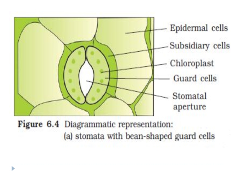 поглощение калия из соседних клеток («калиевый насос»). Концентрация клеточного сока замыкающих клеток устьиц резко возрастает. По закону осмоса из прилегающих клеток начинается приток воды в замыкающие клетки, вследствие чего в них резко увеличивается объем и возрастает тургорное давление. Растягиваться могут лишь спинные стенки и они тянут за собой брюшные стенки. Устьичная щель расширяется, устьице открывается, осуществляя газообмен и транспирацию.