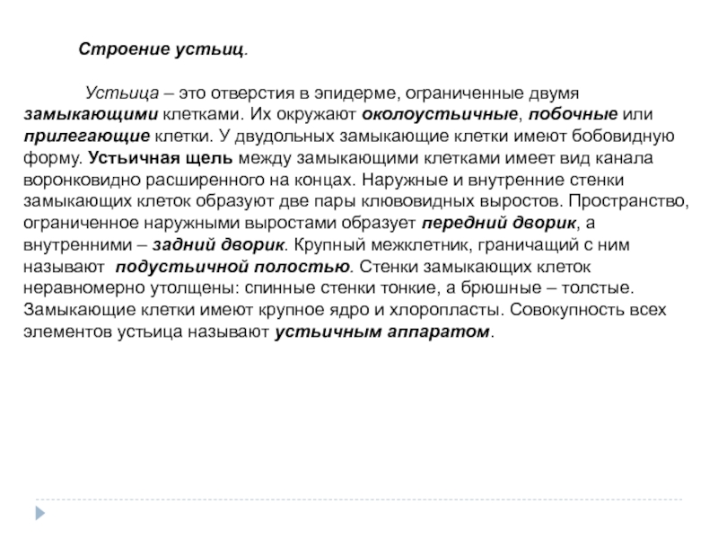 околоустьичные, побочные или прилегающие клетки. У двудольных замыкающие клетки имеют бобовидную форму. Устьичная щель между замыкающими клетками имеет вид канала воронковидно расширенного на концах. Наружные и внутренние стенки замыкающих клеток образуют две пары клювовидных выростов. Пространство, ограниченное наружными выростами образует передний дворик, а внутренними – задний дворик. Крупный межклетник, граничащий с ним называют подустьичной полостью. Стенки замыкающих клеток неравномерно утолщены: спинные стенки тонкие, а брюшные – толстые. Замыкающие клетки имеют крупное ядро и хлоропласты. Совокупность всех элементов устьица называют устьичным аппаратом.