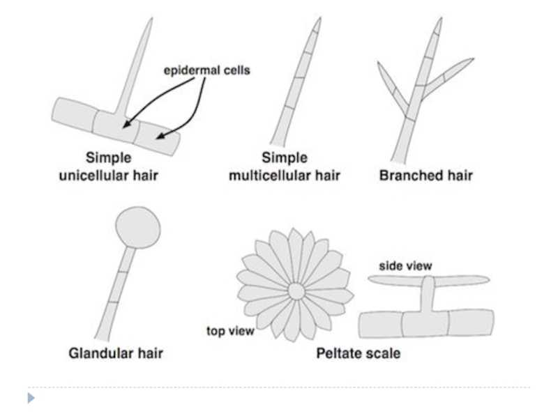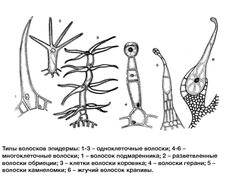 Слайд 26Типы волосков эпидермы: 1-3 – одноклеточные волоски; 4-6 – многоклеточные