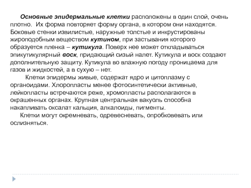 Слайд 5Основные эпидермальные клетки расположены в один слой, очень плотно. Их