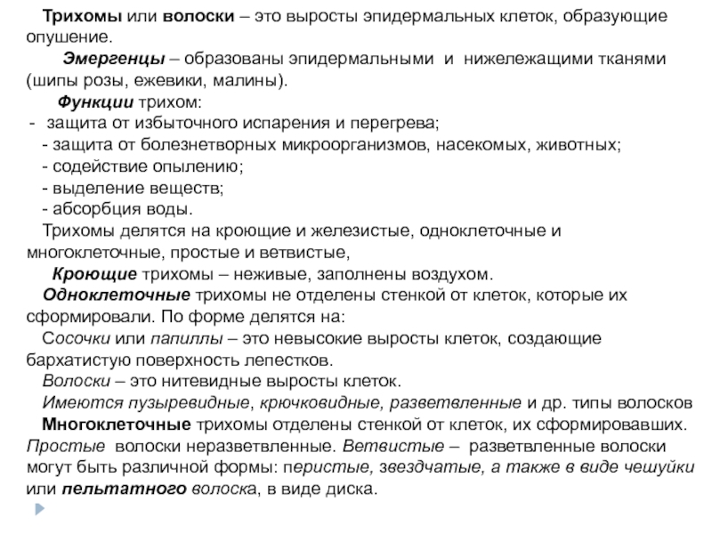 Слайд 20Трихомы или волоски – это выросты эпидермальных клеток, образующие опушение.