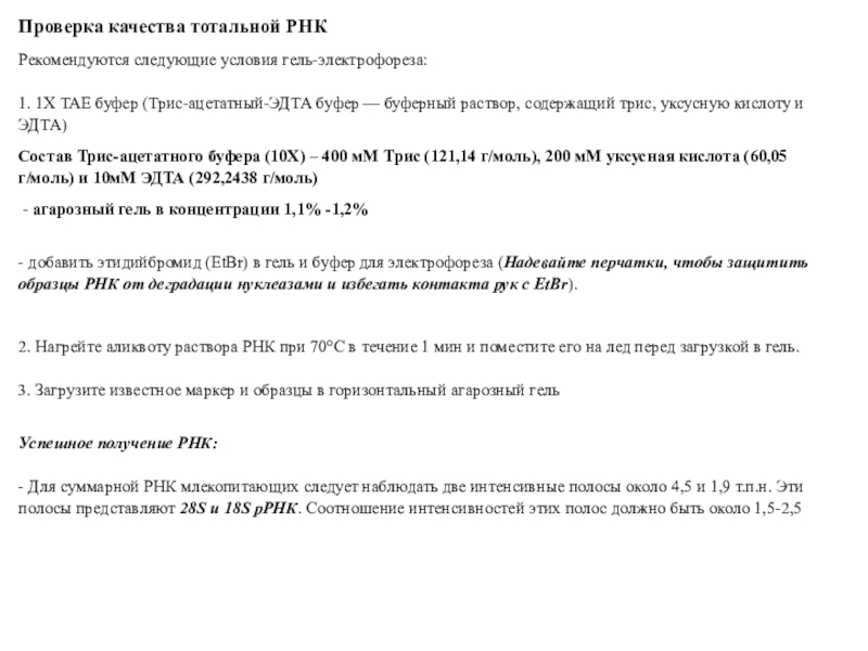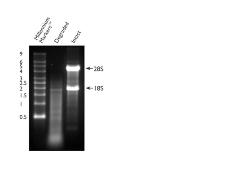 - Для суммарной РНК млекопитающих следует наблюдать две интенсивные полосы около 4,5 и 1,9 т.п.н. Эти полосы представляют 28S и 18S рРНК. Соотношение интенсивностей этих полос должно быть около 1,5-2,5