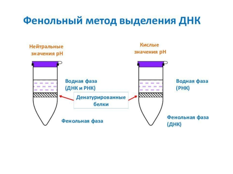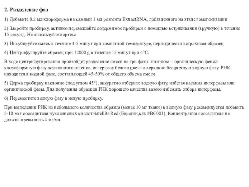 В ходе центрифугирования произойдет разделение смеси на три фазы: нижнюю – органическую фенол-хлороформную фазу желтоватого оттенка, интерфазу белого цвета и верхнюю бесцветную водную фазу. РНК находится в водной фазе, составляющей 45-50% от общего объема смеси.