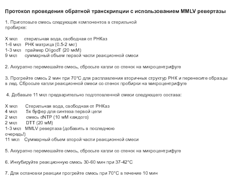 Слайд 24Протокол проведения обратной транскрипции с использованием MMLV ревертазы
