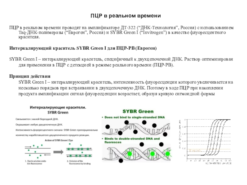 SYBR Green I – интеркалирующий краситель, интенсивность флуоресценции которого увеличивается на несколько порядков при встраивании в двухцепочечную ДНК. Поэтому в ходе ПЦР при накоплении продукта амплификации сигнал флуоресценции возрастает, образуя кривую сигмоидной формы