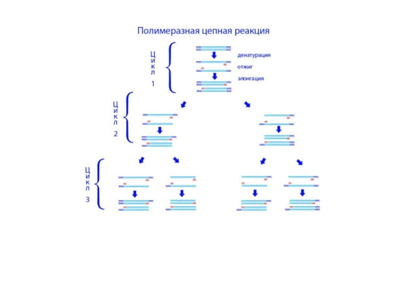 3. элонгация (синтез двухцепочечных ДНК при 72°С с каждым из праймеров навстречу друг другу по противоположным цепям ДНК)