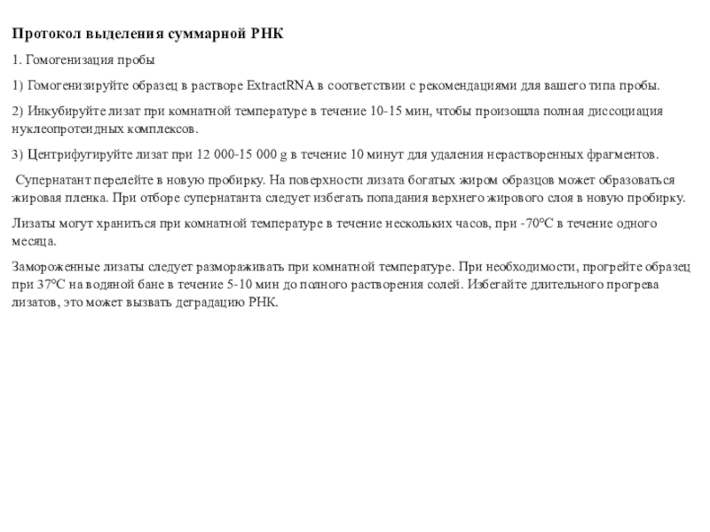 Замороженные лизаты следует размораживать при комнатной температуре. При необходимости, прогрейте образец при 37°C на водяной бане в течение 5-10 мин до полного растворения солей. Избегайте длительного прогрева лизатов, это может вызвать деградацию РНК.