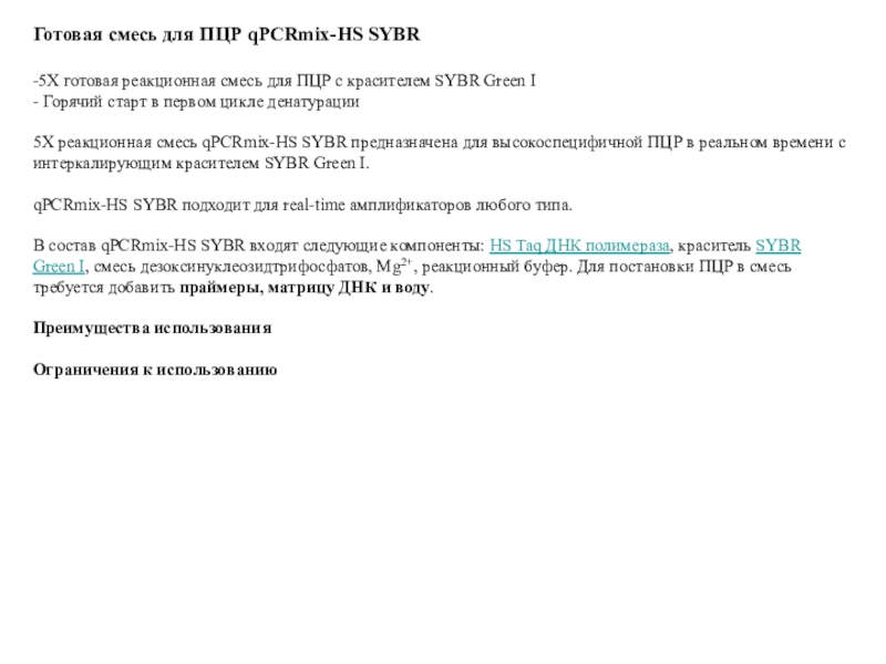 5X реакционная смесь qPCRmix-HS SYBR предназначена для высокоспецифичной ПЦР в реальном времени с интеркалирующим красителем SYBR Green I.