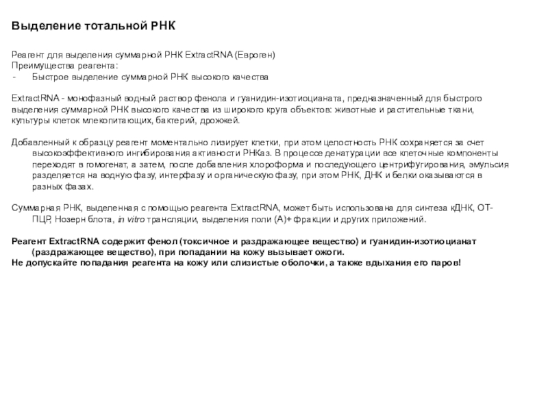 Реагент ExtractRNA содержит фенол (токсичное и раздражающее вещество) и гуанидин-изотиоцианат (раздражающее вещество), при попадании на кожу вызывает ожоги.