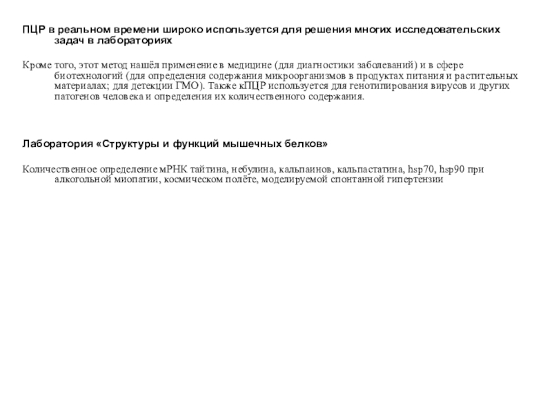 (для диагностики заболеваний) и в сфере биотехнологий (для определения содержания микроорганизмов в продуктах питания и растительных материалах; для детекции ГМО). Также кПЦР используется для генотипирования вирусов и других патогенов человека и определения их количественного содержания.