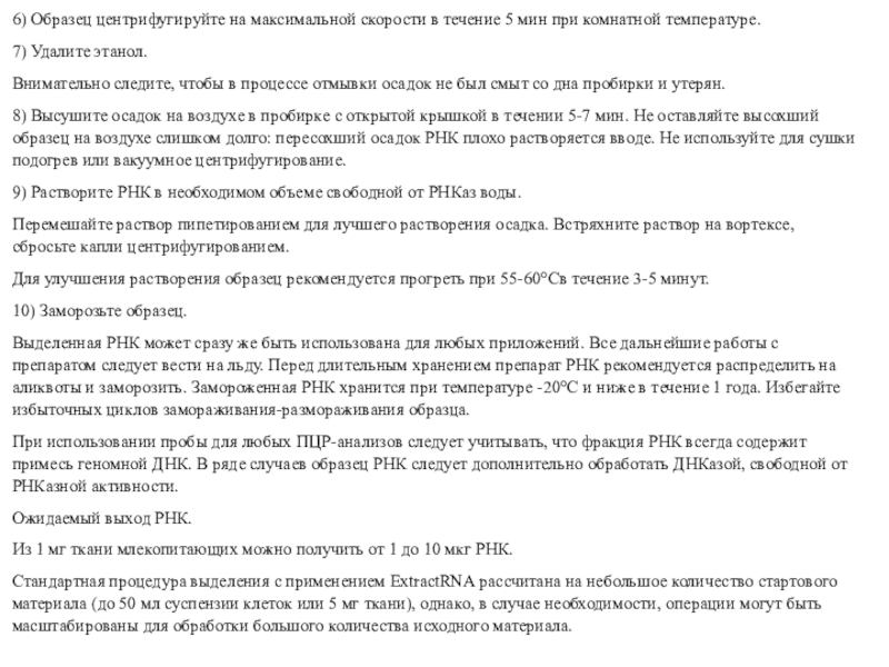 8) Высушите осадок на воздухе в пробирке с открытой крышкой в течении 5-7 мин. Не оставляйте высохший образец на воздухе слишком долго: пересохший осадок РНК плохо растворяется вводе. Не используйте для сушки подогрев или вакуумное центрифугирование.