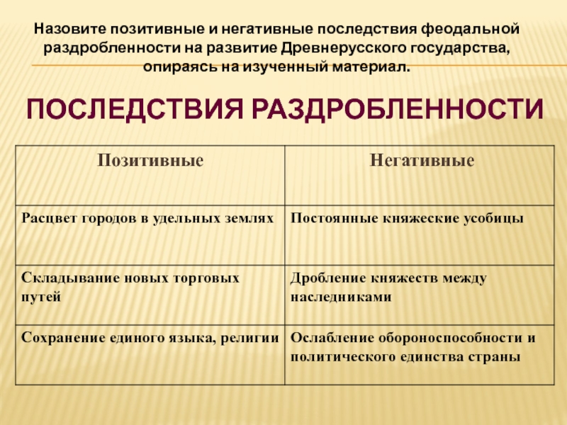 Назовите позитивные и негативные последствия феодальной раздробленности на развитие