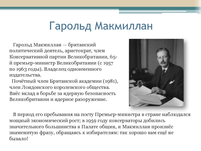 В период его пребывания на посту Премьер-министра в стране наблюдался мощный экономический рост; в 1959 году консерваторы добились значительного большинства в Палате общин, и Макмиллан произнёс знаменитую фразу, обращаясь к избирателям: так хорошо вам ещё не бывало!