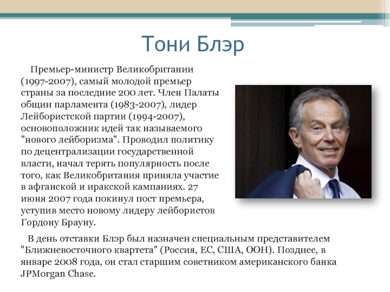 В день отставки Блэр был назначен специальным представителем "Ближневосточного квартета" (Россия, ЕС, США, ООН). Позднее, в январе 2008 года, он стал старшим советником американского банка JPMorgan Chase.
