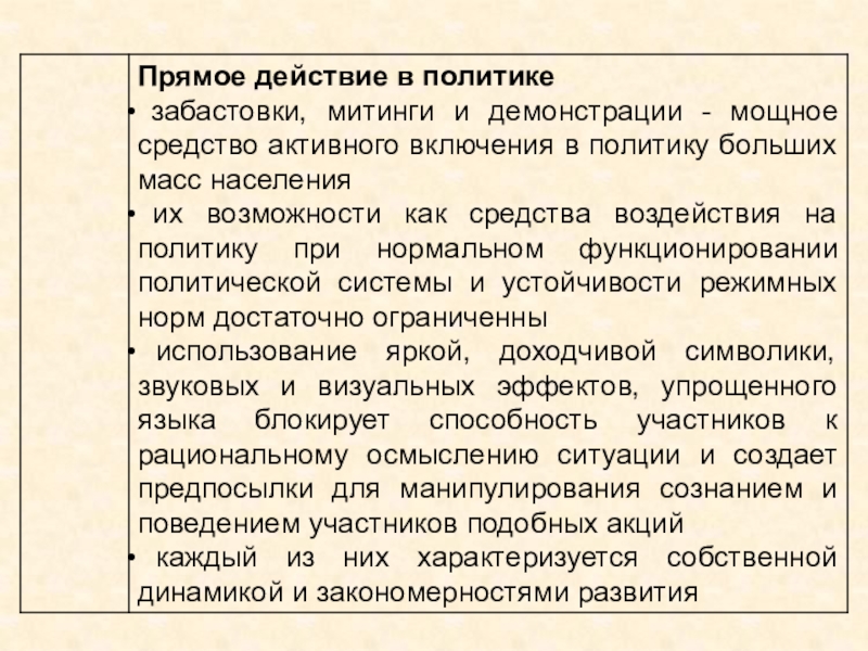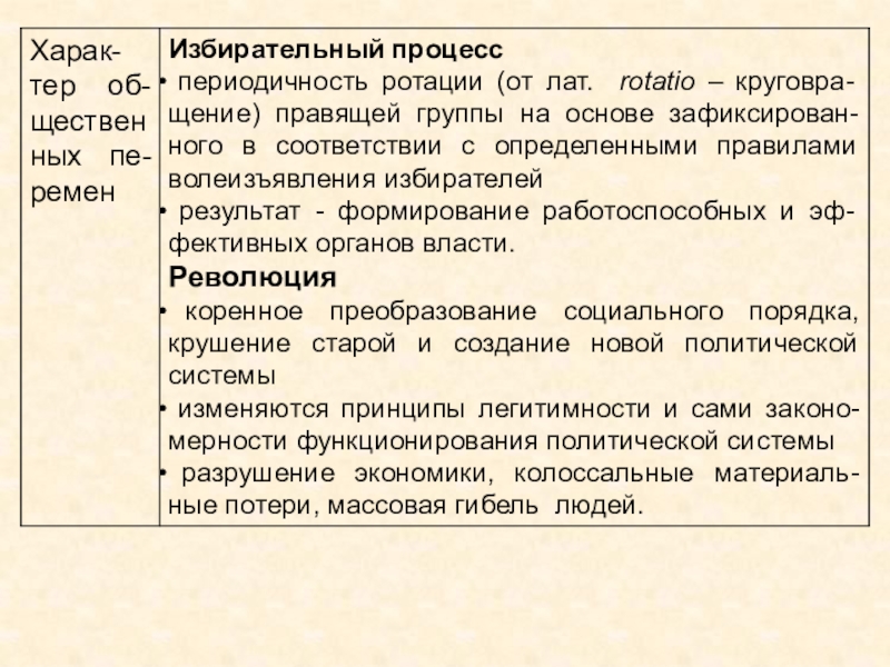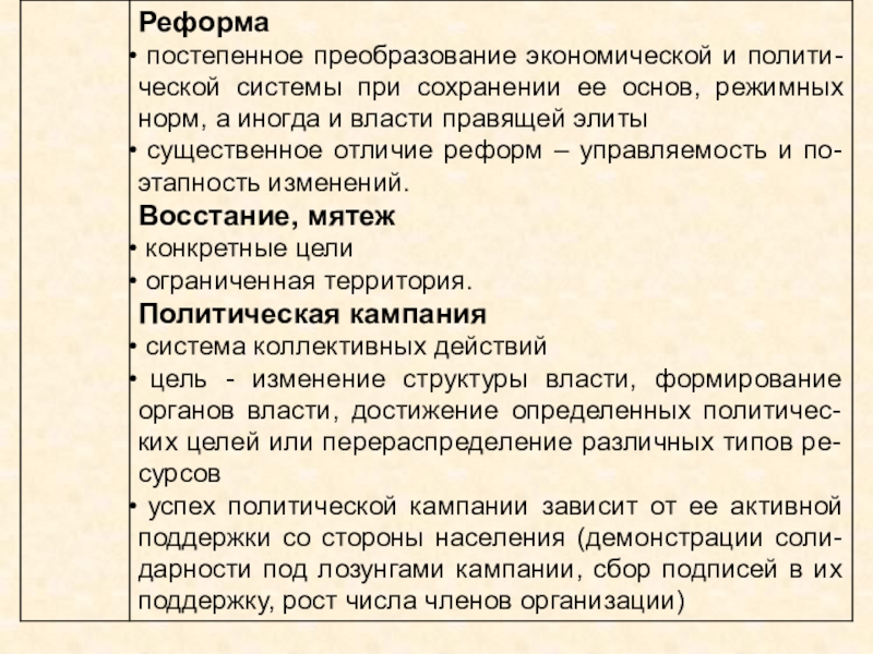 г) в зависимости от характера общественных перемен (избирательный процесс, революция, контрреволюция, реформа, восстание, мятеж, политическая кампания, прямое действие в политике).