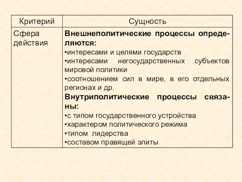 а) по сфере действия (внешне- и внутриполитические процессы);
